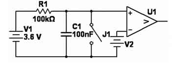 这是一个简单的RC充电电路(见图2)。其工作流程是:J1先闭合,释放C1上的电荷;然后J1打开,由R1对C1进行充电;电压比较器U1将C1上的电压与参考电压V2比较,当C1电压超过V2时输出高电平。统计从J1打开到U1输出高电平之间的时间,便可以确定V1的电压大小。可以直观地看出,V1越高,这段时间越短。