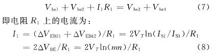 其中:m为2条支路上的电流的比值;n为Q1和Q2的发射结面积之比。该电流是与绝对温度成正比的PTAT电流,且与电源电压无关。Vref的值为: