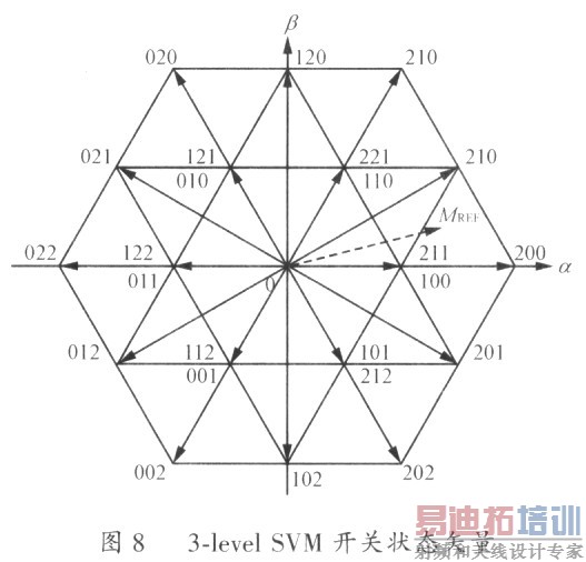 2-levelSVM的丌关状态矢量如图7所示,其实现方法是:在一个采样周期内,参考矢量vi,vi+1由相邻的两个非零开关矢量vi、vi+1和零矢量v0合成,如式(11)所示。
