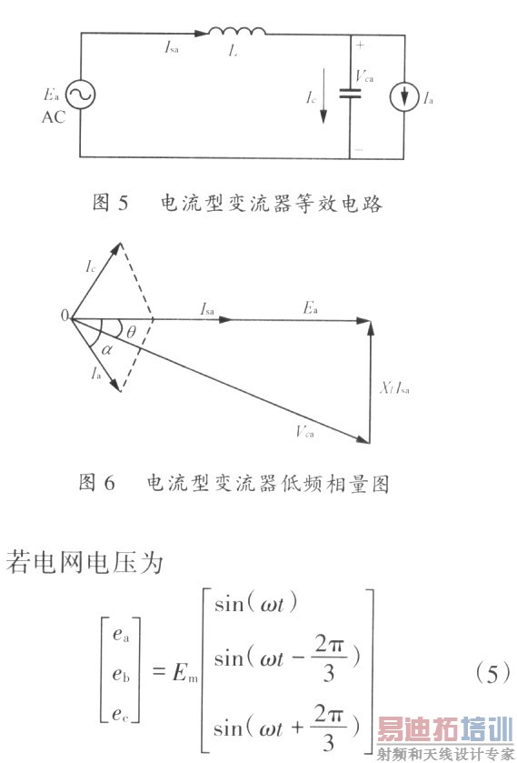 三相电压型SPWM变流器主电路拓扑如图1所示。从直流侧的角度出发,以单位功率因数整流器为例,讨沦三相电压型SPWM变流器的低频数学模型。电压型单位功率因数变流器的等效电路如图2所示。其低频相量图如图3所示。在低频时式(1)成立。