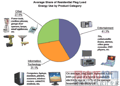 美国每年的住宅电能消耗总量达13000亿kWh。其中,17%来自“插头负载(plug load)”,耗电量达到2 210亿kWh。这部分的电能消耗可划分为占31.1%(687亿kWh)的信息技术产品,占41.3%(913亿kWh)娱乐产品,“其他”占27.6%(610亿kWh)。图1显示了这种电能消耗划分。