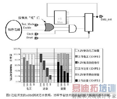 为了表明SOC中高水平功率管理的潜力,Synopsys公司与ARM、NS和Artisan公司共同合作,制造了一款用于验证大幅节省功耗效果的测试芯片。此芯片采用专门的硬件和软件,以控制不同芯片域内的电压和时钟频率,并对本文上述的电压和频率按比例缩放技术应用了高层次控制。