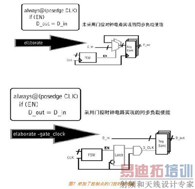 当无需触发器的输出信号时,RTL级门控时钟能够将通向大型寄存器组的时钟信号关断。图6所示为没有门控时钟和带有门控时钟的设计编辑的同步负载使能电路的比较。Power Compiler能够自动插入门控时钟电路,将图6a中的反馈网和多路转换器替代为图6b中的锁存器和插入到寄存器时钟网的双输入门电路。