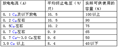 蓄电池放电时电压不能低于终止电压,否则会损害电池寿命。放电电流与终止电压关系如下表: