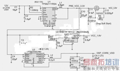 我们构建了若干个电源管理参考设计,并进行数字音频/视频应用的测试。这些设计均采用TI的TMS320DM6 43和TMS320DM6 46处理器,这些处理器能满足排序、电压精度和启动要求。图1是12V电源的参考设计电路图。该设计采用TPS62111同步降压转换器、TPS62040同步降压转换器以及TPS73618低压降调节器,它们分别提供3.3V、1.2V和1.8V电压轨。这种参考设计包含一个简单的外部MOSFET、电阻和电容延迟电路,以使3.3V电压轨能满足自升压模式排序方案要求。TPS62040不但提供1.2V的内核电压,而且还可满足引脚5软启动电容的排序要求。这种解决方案的容差为±3%,效率在90%以上。为满足主机升压模式排序方案要求,可以将一个类似的MOSFET、电阻以及电容电路增加到1.2V电压轨。