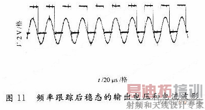 选取的超声换能器型号是DH-6160F-15S-3,其谐振频率为25 kHz,谐振阻抗为15Ω,静态电容为27000 pF,通过计算,其匹配电感为O.75 mH。图7、图8分别给出移相角分别为φ=0°,φ=45°时的输出电压u和输出电流i仿真波形。由仿真波形比较分析,当移相角φ逐渐增大,其输出电压脉宽逐渐减小,电流幅度逐渐减小,可见调节φ的大小即可以实现输出功率的调节。另外,功率管工作在ZVS软开关状态,降低了开关损耗和电压电流应力,逆变器始终工作在负载谐振状态,负载侧的功率因数高,控制简单,提高电源的可靠性。根据前面的设计,对3 kw/30 kHz的超声波发生器进行实验,下面给出逆变桥的驱动波形,PS-PWM控制输出波形,频率跟踪实验波形。图9为θ=60°时Z1和Z4的驱动波形,图10为θ=60°时输出电压和电流波形;图11为频率跟踪后稳态的输出电压和电流波形。
