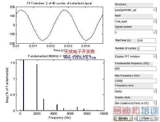 通过搭建小容量的试验机,控制系统每个环节的设计都得到了近似工作现场的考验,经过在试验过程中不断的调整,软硬件设计都基本趋于完善。最终大容量30kVA的样机设定的各控制参数如下:输入电压220V/50Hz,输出电压115V/400Hz,载波频率为18kHz,输出功率为30kVA,输出滤波电容C = 300 F,输出滤波电感L = 70 H。图6、图7分别为阻性负载和感性负载时的电源输出电压波形,经过对输出电压的谐波分析,输出电压的THD值达到了要求的性能指标THD≤3%,结果证明了控制系统的可行性。