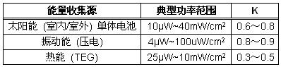 Pa (即平均功率) 是关键项,它将告诉我们哪些类型的能量收集换能器 (如果有的话) 会适合该系统。表 1 罗列了一些典型的换能器以及它们所能提供的典型平均功率。用 (K) 标示的竖列所给出的是功率转换常数,它考虑到将换能器能量转换为一个可用电压 (在此场合中为 3.3V) 所需的电源管理模块的类型。理想的功率转换器具有一个 K = 1。K 将因所采用的换能器类型的不同而存在差异。一般来说,K 与换能器的输出电压成比例。由于非常低输出电压换能器 (例如:TEG) 需要一个极高的升压比以及相应的高输入电流,因此其功率转换常数K 往往要比诸如压电元件等非常高输出电压换能器低。由上面的例子可见,所需的平均功率 (Pa) 接近压电换能器的功率范围上限,但处于 TEG 和光伏 (PV) 换能器或太阳能电池的功率能力范围之内。