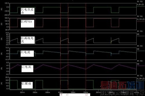 上面的工作模式是电流连续的CCM模式。在原图的基础上,把电感量降低为80uH,其他参数不变,仿真看稳态的波形如下: