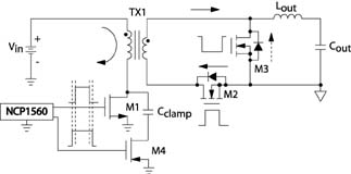 如图2所示,有源箝位拓扑结构是正激变换器的延伸。但是,增加了开关M4、电容Cclamp和相应的控制电路(如NCP1560 IC),这样使电路又具有了诸多新的优势。为了理解这些优势,现在详细介绍一下变换器是如何工作的。变换器的主要工作原理与正激变换器相似,也就是说,当开关M1打开时,功率从输入向输出传输。在M1关闭时,输出电感向输出提供能量,其功率转换方程为
