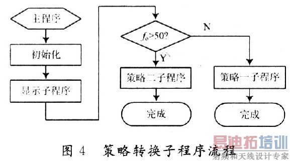 在相应的控制算法下其拟合示意图如图3所示。其实质上类似于直流斩波电路,不过在此其是对交流斩波。利用该拟合方法进行输出得到的电压比较平稳。第二种控制策略较为简单在此不做详述。高频和低频控制策略的转换通过软件来实现,输出U0的频率f0可以通过人机交互装置进行设定(假如设定50 Hz以下为低频,以上为高频),其子程序结构框图如图4所示。