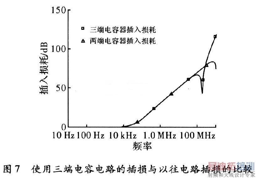 (1)使用三端电容的电路的插损与以往电路插损的比较。