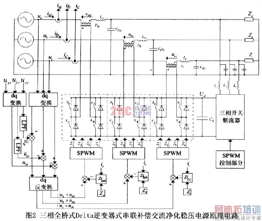 瞬时无功理论(日本学者赤木泰文于1983年首次提出)检测原理的改进方法一基于同步旋转Park变换的d-q法,是目前谐波实时计算的主要方法,此法的特点是不仅简化了对称无畸变下的电流增量检测,而且也适用于不对称有畸变的市电电压检测。因此文章对采用d-q法来实现三相半桥式Delta逆变器式交流净化稳压电源进行了研究,并给出了仿真和实验结果与分析。