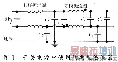 脉冲电流回路通过电磁感应其他电路与大地或机壳组成的回路产生的干扰信号为共模信号;开关电源电路中开关管的集电极与其他电路之间产生很强的电场,电路会产生位移电流,而这个位移电流也属于共模干扰信号。图1中共模滤波器就是用来抑制共模干扰,使之受到衰减。