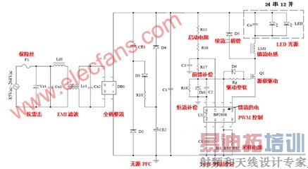 从AC220V看进去,交流市电入口接有1A保险丝F1和抗浪涌/雷击的压敏电阻Vz1;之后是EMI滤波器,由Ld1、Lc1和Cx1、Cx2组成;DB1是全桥整流器,内部是4个高压硅二极管;CE1、CE2、R10、D2~D4组成无源功率因数校正电路;BP2808芯片由R15、R16启动电阻降压经R17、C3前馈补偿,并由Dz1、C2、R18与BP2808内部电路组成专利的恒流补偿电路稳压后给BP2808控制电路供电,系统启动后由于控制电路本身静态电流小,以及芯片内部存在从OUT到VCC的馈流二极管可向BP2808提供工作电源,此时电阻R15-17上通过的电流将大大降低,因而总的系统功耗也大大降低,系统效率得到明显提高。专利的源极驱动电路由MOS管Q1、D6、Rg、Rt 、Rcs与BP2808内部电路组成,其显着特点是有效降低功耗、提高恒流精度。源极驱动方式的驱动电路使系统消耗电流减少,尤其是减少了传统的高压差供电通路中类似R15-17上的电流,从而降低了功耗,提高了效率。D6、Rg可使开关开通驱动变软,关断驱动保持较强,既改善EMI,又尽量不牺牲效率。与LED光源并联的输出滤波电容C0用以减少LED光源上的电流纹波。