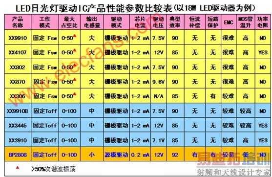 表1:LED日光灯驱动IC产品性能参数比较表。