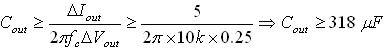 如果我们假定由fC、输出电容(Cout)及最大阶跃负载电流(ΔIout)确定出ΔIout 时的最大压降(Vout)为250 mV,我们就能写出下述等式: