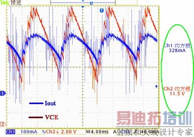 通过以上的分析以及实验发现通过降压DC-DC改造的Cuk和B2方案都不是真正意思上的升降压型的恒流控制,但是我们发现针对于3*1W的LED-MR16应用,B2方案很好地满足了大多数客户应用的需要。因为电子变压器通过整流滤波出来的波形如图16所示VCE,最高电压15.8V,最低5.6V,平均值11.5V。LED-MR16输出电流IOUT最高值380mA,最小值200mA,平均值328mA。这对于LED其亮度和寿命主要由输出电流平均值决定的来说,BP1361的B2方案好正是一种性价比极好的解决方案。