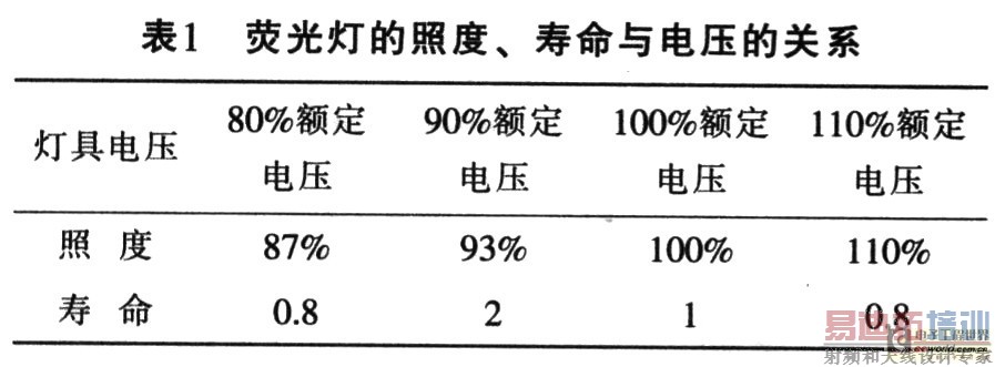 由表1可知,若电网电压为额定电压220 V,采用90%额定电压供电时,灯具寿命可延长一倍,照度衰减7%。从人体视觉学可知,人的眼睛对光强度变化的感觉是按对数关系计算的,照度衰减7%,人的视觉能够感觉到光线变暗1.6%,此时节约电能19%,可以达到最佳能效比。如电网电压超过220 V,则节能率一般在20%以上。所以,90%额定电压为室内照明供电最优运行与节能电压。