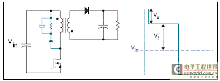 RCD箝位的电阻器总会浪费功率。即使在转换器上有很小的负载,电容器都将进行充电高达从转换器次级反射的电压,即vf。由于负载增加,更多能量将流入电容器,而电压将提高更多,即vx,它在理想的方波反激电压之上。该波形定义了这些电压,如图2所示。