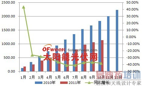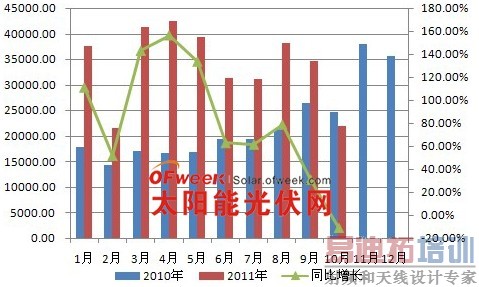 图表2:2010.01-2011.10我国多晶硅累计进口量情况(单位:吨)