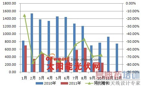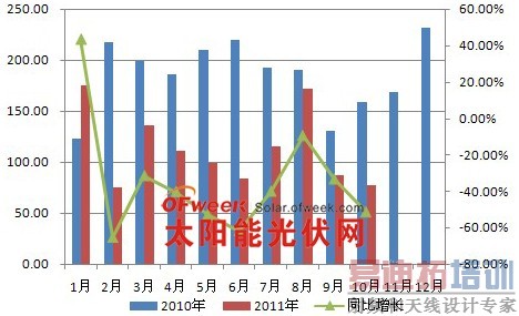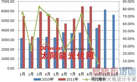 海关统计数据显示,1-10月份全国多晶硅进口量达到53109.78吨,同比增长48.58%,增速有所回落。10月份当月全国多晶硅进口量4565.84吨,同比增长7.63%,增速较上月大幅回落。