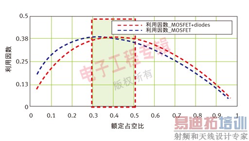 图中的两条曲线显示了只考虑开关MOSFET应力(蓝色虚线)计算出来的利用系数,以及考虑了二次侧开关MOSFET和整流二极管(红色虚线)的利用系数。