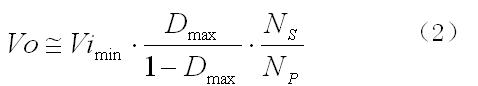 公式(2)给出了输出电压Vo和输入电压Vi(因为其简单性没有考虑Q1和二次侧整流管Q2两端的压降)之间的主要关系。为了确保在整个输入电压范围Vo的稳压,最大占空比可以任意选定一个<1的理论值。