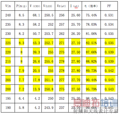 由表中可知,当市电电压在200~225VAC的服务内变化时基本上可以保持恒流在27.1~27.8mA的范围内,而且效率在82.5%~95.79%范围内,即使在输入电压过低而无法恒流时,它的效率还能高达98-99%,这是采用恒流二极管的一个很大的优点。