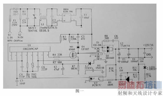 图一所示是输出为12V3A的并联型反激式开关电源,作为14英寸至17英寸的液晶显示器的电源适配器之用。