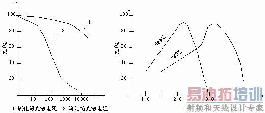 对于不同波长的入射光,光敏电阻的相对灵敏度是不相同的。各种材料的光谱特性如图2.6.4所示。从图中看出,硫化镉的峰值在 可见光区域,而硫化铅的峰值在红外区域,因此在选用光敏电阻时应当把元件和光源的种类结合起来考虑,才能获得满意的结果。
