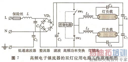 ① 单灯、双灯或4灯应用的电子镇流器。电子镇流器的双灯应用电路工作原理框如图7所示。
