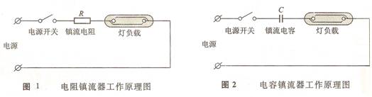 电阻镇流器工作原理如图1所示。电阻镇流的工作效率低,要确保电阻镇流电路正常工作,应使电源供电电压不低于2倍的灯工作电压。实用中应用不多。