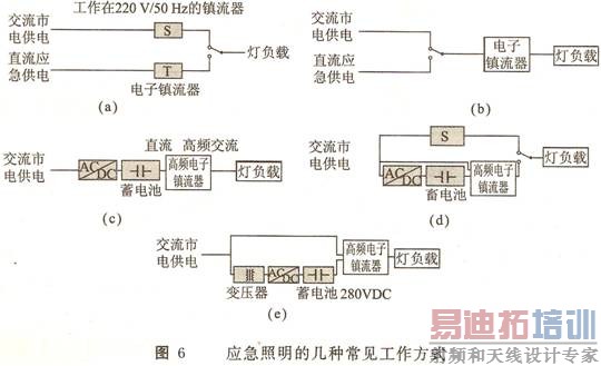·应急照明系统,例如交流供电骤然断电时,利用蓄电池供电的照明,工作原理框图分别如图6(a)"(e)所示。