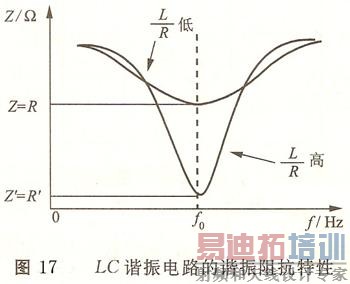 LC谐振电路的谐振阻抗特性如图17所示,由图17可以看出,在谐振频率f0处,L/R值越大,则谐振电路的Q值越高,灯电路的电流也就越大,反之,L/R值越小,则灯电路的电流越小。在荧光灯电子镇流器的设计中,应适当选取L和C的数值,使电路的Q值在3左右。