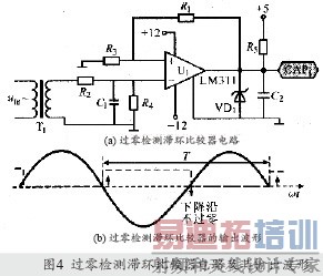 为了实现对电网电压、频率和相位的跟踪,可利用一个比较器进行过零检测,以提高抗干扰能力及保证检测的快速性,工程上所用的比较器一般为滞环比较器。图4示出过零检测滞环比较器电路及其输出波形。