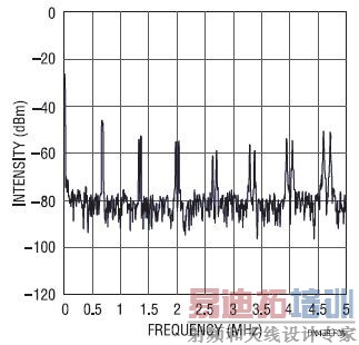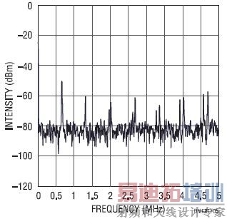 图 6:两个 LTM8058 的反激式输出串联连接之噪声频谱 (在一个 100mA、10VOUT负载情况下)