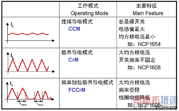 为了满足大功率LED路灯电源设计在功率因数以及谐波含量限制方面的要求,安森美半导体提供三种工作模式的PFC方案选择:连续导电模式(CCM),如NCP1654;临界导电模式(CrM),如NCP1608;频率钳位临界导电模式(FCCrM),如NCP1605。