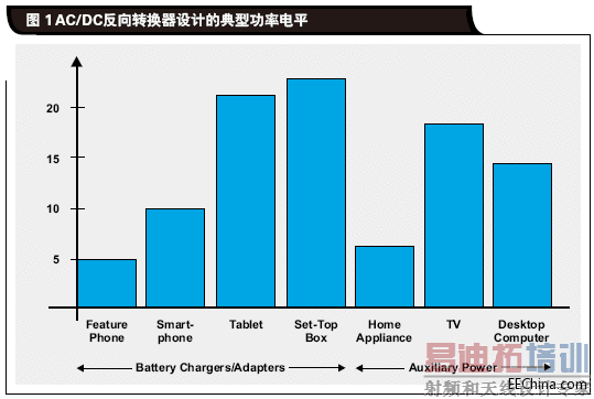 就低功率AC/DC 转换而言,反向拓扑因其结构简单和成本低仍然是人们的首选。只需使用少量的外部组件,这种拓扑便可提供一个或多个输出,实现非常宽的输入电压范围。它能够以隔离和非隔离方式使用,适用于大量应用,例如:智能电话和平板电脑的电池充电器;电视机、桌面计算机和各种家用电器的辅助电源;便携计算机、机顶盒和网络设备的AC适配器等。图1显示了这些应用中一部分的典型功率电平。消费类市场中对反向拓扑结构的大量采用及其广泛的适用性(图1所示2012 年世界市场估计出货量超过数十亿件),让它成为对所有性能指标进行优化的一个理想选择,例如:成本、效率和待机功耗等。