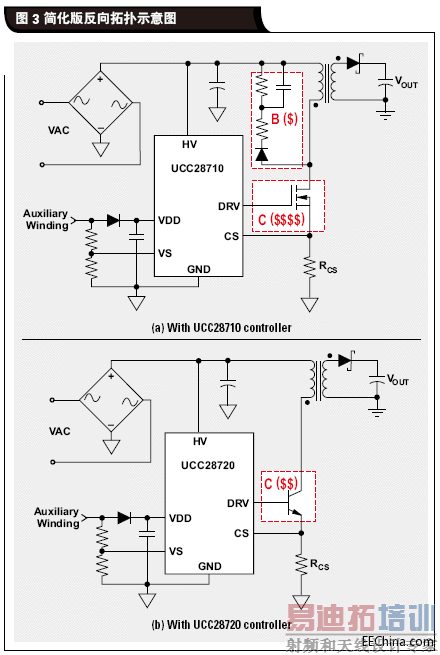 图3b显示了驱动一个BJT的高集成度解决方案。UCC28720控制器集成了一个驱动器,它根据转换器负载,动-态地稳压基极电流大小。这样可以确保BJT始终工作在最佳开关状态下,即使是更高功率的AC/DC 设计,开关和传导损耗也都最小。