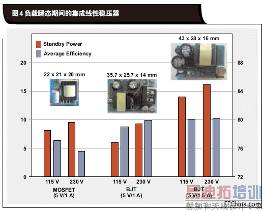 两个5V/1A USB 充电器用于描述前面的一些点。图4简单列出了它们的-测试数据。请注意,该控制器让低于10mW 的超低待机功耗成为现实。经过优化的调制和驱动方案,还帮助实现高平均效率,以达到世界上大多数严格的能耗规定。参考2和3给出了这些设计的完整测试数据和一份材料清单。图4包括了一个高功率5V/1.5A 设计的测试数据,目的是说明这种BJT型解决方案可以提供80+%的平均效率。