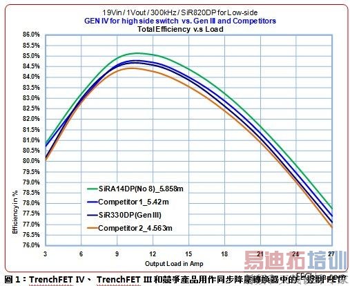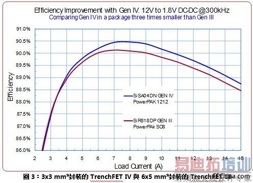 图1演示了在同步降压转换器中使用TrenchFET IV做为“控制FET”的情况,TrenchFET IV的效率比TrenchFET III高0.5%,电流最高达27A。