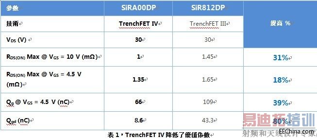 TrenchFET® IV是TrenchFET功率MOSFET家族中的最新一代产品。与TrenchFET III相比,TrenchFET IV的导通电阻(RDS(ON))和栅极电荷(QG, QGD)数值都有所减小,降低了同步DC/DC转换器中的损耗。过去,降低RDS(ON)通常会以更高的栅极电荷做为折中。但TrenchFET IV采用一种新的高密度设计,同时实现了优化的栅极电荷水平和更低的RDS(ON)。表1比较了TrenchFET IV产品SiRA00DP和采用以前最先进技术的SiR812DP TrenchFET Gen III功率MOSFET。新器件的RDS(ON)和Qg分别低30%和39%。