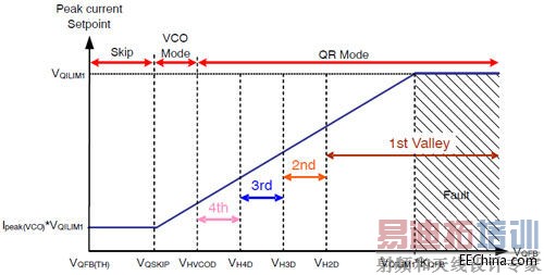 反激控制器采用准谐振峰值电流模式工作,带谷底锁定功能。准谐振反激控制器开关驱动器(QDRV)关闭期间延迟3 µs,消隐漏电流振铃效应。反激控制器内置4 ms软启动,包含128 ms定时器用于短路检测(提供自动恢复或闩锁选择)。反激控制器支持轻载工作模式,在第4个谷底后采用压控振荡器(VCO)工作模式,最低频率被限制为 23.5 kHz;负载更轻时强迫进入跳周期模式,进一步节省能耗(见图2)。其它特性包括ZCD引脚上结合过功率补偿等。