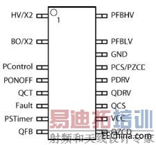 NCP1937采用SOIC-20封装,图1显示的是其引脚配置图。其中,HV/X2引脚用于高压启动电路输入,还用于输入X电容放电。BO/X2引脚为整个IC执行输入欠压检测,还用于为输入X电容放电并检测线路电压范围。PControl控制PFC传导误差放大器输出,补偿网络连接此引脚及地,以设定环路带宽。而连接在PONOFF引脚与地之间的电阻设定PFC关闭阈值。PSTimer引脚进行省电模式控制及定时器调节。更多引脚功能参见NCP1937数据表。