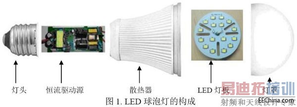 对于球泡灯来说,它的构成已经是非常接近标准化的了。它主要是由三大部分构成:LED光源、恒流驱动电源、散热器和外壳(包括灯头和灯罩)。