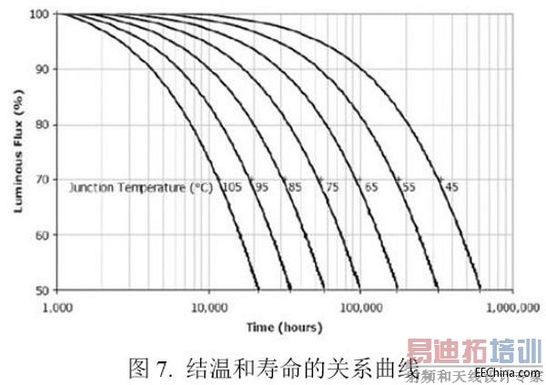 因为8.85W的LED并不是这8.85W全部变成了热,而是有一部分变成了光发出去。当前的LED的发光效率在30%左右。假定发光效率为40%,那么有60%的能量都变成了热量,也就是有5.4W的热量需要散发出去。现在又增加了1.15W,变成6.55W。也就是增加了21.3%的热量。虽然本来的散热器也需要把这部分热量散发出去,但是现在把这部分热加到了LED灯板。因为电源是放在灯板的电路面,而电路面要传到散热器需要通过两个绝缘介质,一个是印制板的绝缘介质,另一个是铝基板和散热器之间的绝缘介质,所以电路面的温度和散热器的温度是不同的,而LED是放在铝基板的电路面的。也就是说由于电源放到了电路面就会使铝基板的电路面热量增加了21.3%,这会导致LED的结温也升高21.3%。而结温增加对寿命的影响到底有多大呢?这可以参看Cree公司给出的结温和寿命的曲线(图7)。