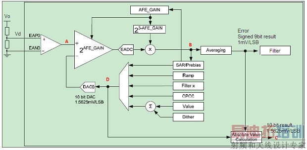 EADC 的输出是参考电压与输入模拟量相减后的值在数字化之后的信息量,即数字误差量,其范围与AFE 自身的增益有直接关系。例如,当增益值设置为1 时,其输出范围是+248~-256;而增益设置为8 时,输出范围是+31~-32.