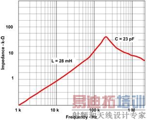 一旦您选定了磁芯材料,接下来的最大挑战就是如何充分利用磁芯材料的高磁导性(请参见图 3),该图显示了 28 mH 阻抗共模与频率的关系。在低频率时,该器就像是一个电感器,但是在高频率时其更像是一个分布电容,该电容与电感共振。由于该大电感,23 pF 分布式电容就会影响电感在 200 kHz 以上时的性能。设计一款高性能共模电感的关键就是选择扇形绕组、单个绕组并精心选择磁芯最小化绕组的数量来最小化电容。有时这些共振是不可避免的并且在较高频率时需要额外的滤波。在这些情况下,我们可以再添加一个电感来对较高频率进行滤波。