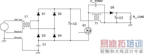 在本篇电源设计小贴士中,我们将继续讨论共模电流问题。如前所述我们可以使用一个机架电容将共模电流返回至电源,该电容还可以降低噪声的源阻抗。然而就我们可以使用的电容大小而言是有一个安全极限的,其决定了共模滤波器的剩余量。共模电流是由 Q1 漏极上的大 AC 开关电压产生的(请参见图 1),其使得电流流经杂散电容进入机架接地。机架电容 C1 为其提供了一个在电源中返回而不会流经 AC 输入源接地连接的路径。共模电感 L1 通过在电源机架和 AC 输入源之间的路径中添加阻抗来限制共模辐射。1 MHz 时,4700 pF 机架电容的最大容许感抗为 30 Ohms。为了让所有开关产生的电流都进入到机架电容 C1,这一电感需要在高频率范围内具有高阻抗(数千欧姆)。